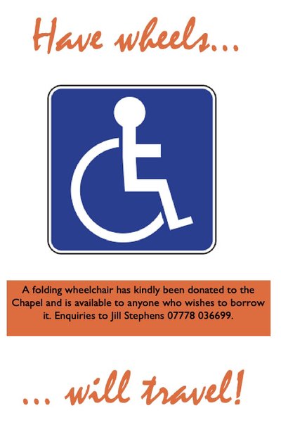Contact this website to borrow the above wheelchair which has been kindly donated to the Chapel. in order to ensure that your message is seen, please get in touch as soon as you know you wish to borrow it. Thank you.